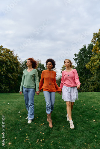 Obraz premium Three stylish women walk hand in hand through a lush green park, exuding...