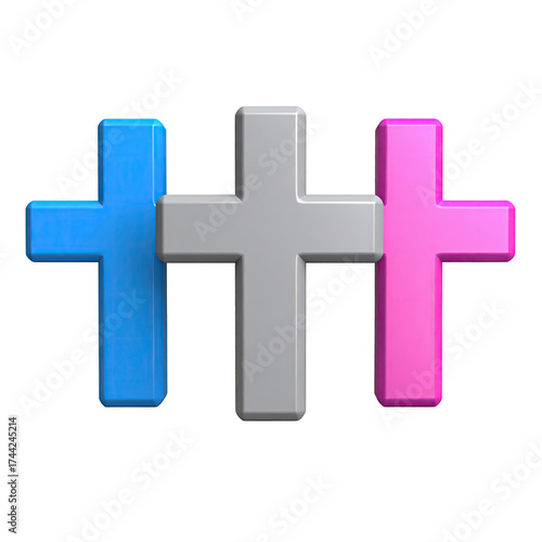 Fototapeta premium Three stylized, 3D crosses in blue, gray, and pink against a black background