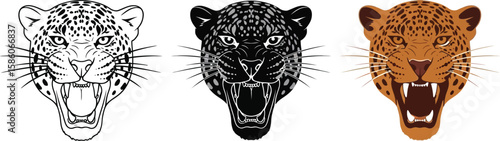 Obraz premium Three stylized jaguar heads showcase different color variations, from a simple black outline to a solid black fill and a classic orange and black spotted design, all with fierce expressions.