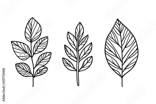 Fototapeta premium Three stylized leaves, nature design, white background, botanical illustration, design element