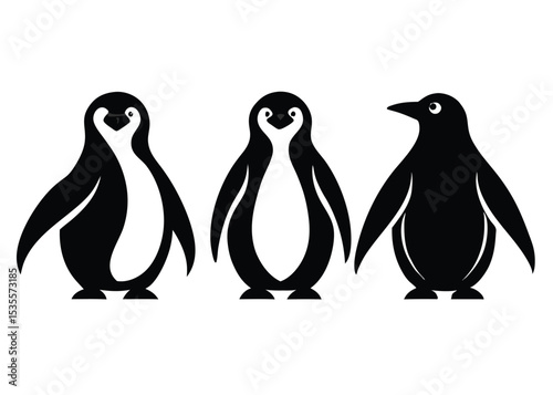 Fototapeta premium Three stylized penguin illustrations in black and white simple modern graphic...