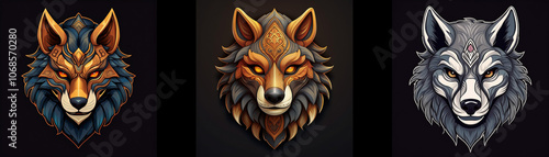 Obraz premium Three stylized wolf heads with different fur patterns and colors.