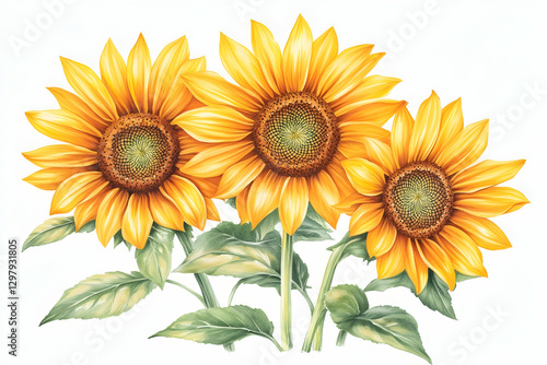 © Nadiyah, Obraz premium Three sunflowers on white background