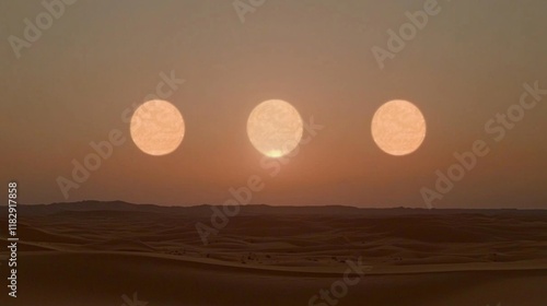 © jamrut, Obraz premium Three Suns Setting Over a Desert Landscape Under a Colorful Sky at Dusk