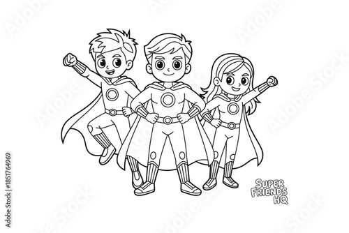 © Aqib, Naklejka premium Three Superhero Kids Standing Together in Black and White Illustration