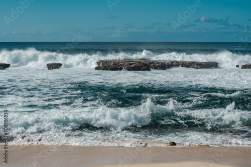 Fototapeta premium Three Tables / Kalahopele Gulch, Pupukea, North Shore, Oahu North Shore, Hawaii. Waves hitting the rocks