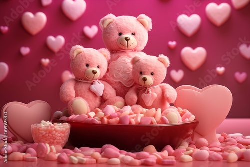 Obraz premium Three teddy bears on a romantic pink background with hearts and sweet marshmallows, a cute illustration of a family of teddy bears for Valentine's day.