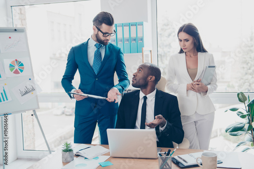 © deagreez, Obraz premium Three thoughtful, stylish, attractive, confident, elegant directors working in work place, station, holding clipchart, gesturing with hand, explaining, having debate, dispute, finding solution