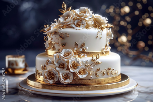 © Olga, Fototapeta premium Three-tiered white wedding cake decorated with flowers and leaves roses. wedding, birthday, party traditional dessert concept. For banner, munu, with place for text.