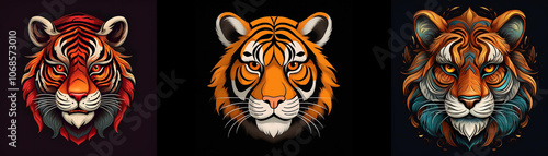© YiuCheung, Fototapeta premium Three tiger head illustrations in different styles on a black background.