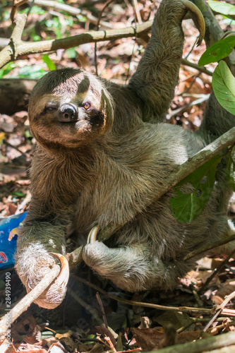 © Helissa, Fototapeta premium Three toed brown-throated sloth on the ground in the Atlantic forest - Itamaraca island, Pernambuco state, Brazil