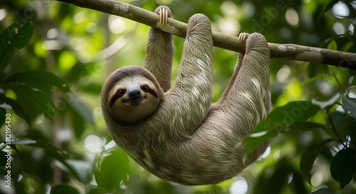 © MdRofiqule, Fototapeta premium Three toed sloth hanging upside down from a branch in costa rica