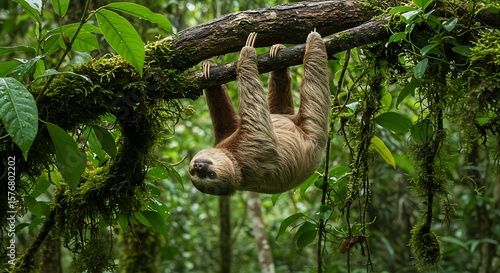 © UQ, Fototapeta premium Three-Toed Sloth Hanging Upside Down From a Moss-Covered Branch in the Jungle, A Charming Sloth Hanging Out in the Lush Green Canopy of a Tropical Rainforest