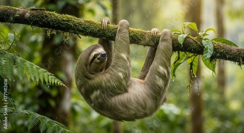 Fototapeta premium Three toed sloth hangs upside down on a mossy tree branch in a lush rainforest