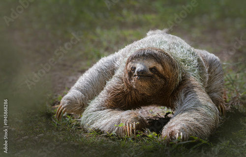 © Carlos, Obraz premium Three toed sloth walking on ground portrait in tropical habitat