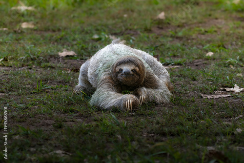 Obraz premium Three toed sloth walking on ground portrait in tropical habitat