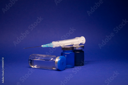 © OliaVesna, Naklejka premium three transparent Vaccine bottle phial with no label, medical syringe injection needle. isolated on blue background. Development of coronavirus vaccine COVID-19. cure. World race in researching