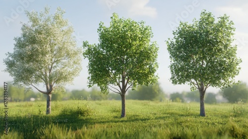 Obraz premium Three trees in sunlit meadow with lush green grass and clear blue sky