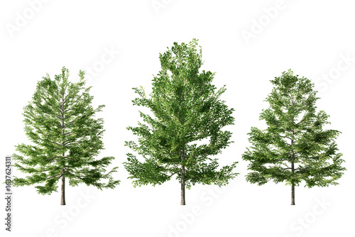 © Frans Kazan, Obraz premium Three trees with different shades of green stand against a white background, representing natural elements for architectural and design projects