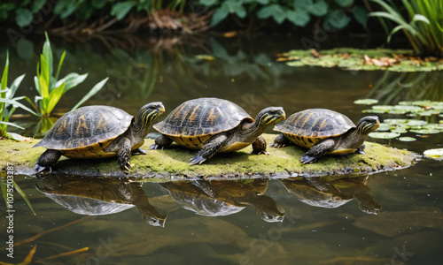 Fototapeta premium Three turtles bask on a mossy rock in a pond on a sunny day