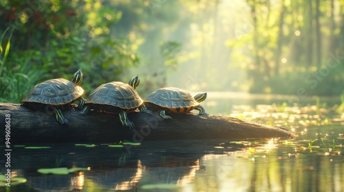 © kucret, Obraz premium Three Turtles on a Log in a Sunlit Forest