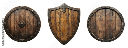 © vectorizer88, Fototapeta premium Three Varieties of Wooden Shields Isolated on Transparent Background