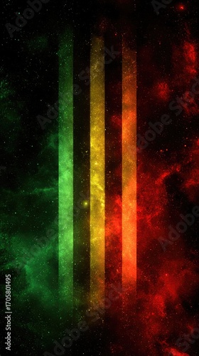 © Muh, Obraz premium Three vertical, luminous stripes?green, gold, red?shine through a dark, nebula-like background speckled with tiny lights