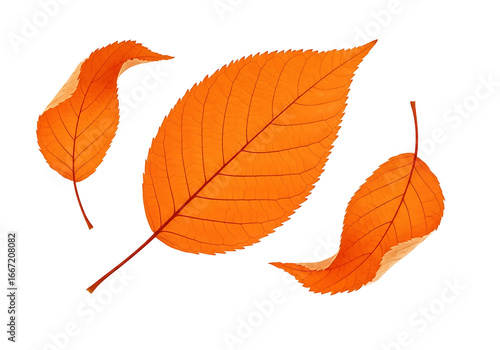 Fototapeta premium Three vibrant autumn leaves, rendered in rich orange hues, appear to float...