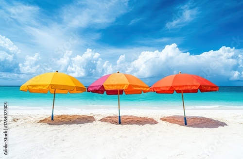Fototapeta premium Three vibrant beach umbrellas under blue sky