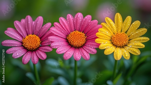 © Lemdah, Fototapeta premium Three vibrant daisies with dew drops.