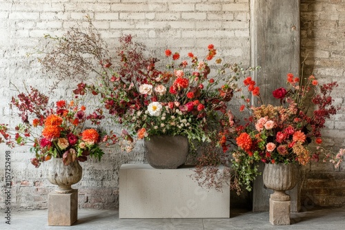© ChaoticMind, Fototapeta premium Three vibrant floral arrangements feature a mix of reds, oranges, and greens set against a rustic brick and wooden backdrop, creating a stunning visual contrast.