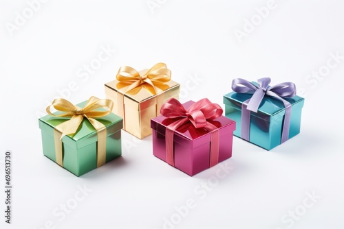 © Fotograf, Obraz premium Three vibrant gift boxes with decorative bows on a clean white background. Perfect for any occasion or celebration