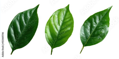 © Studio, Fototapeta premium Three vibrant green leaves against a white background