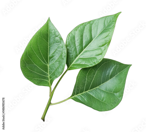© kageyama, Obraz premium Three Vibrant Green Leaves With Visible Veins On A Thin Twig Isolated On A Transparent Background