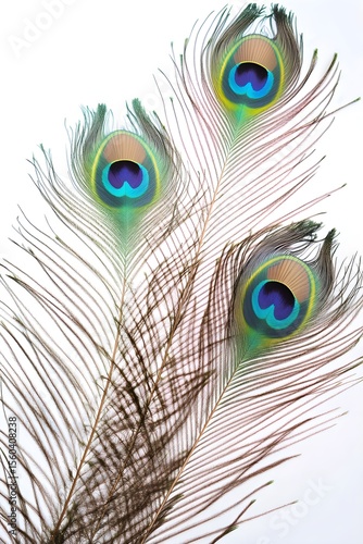 © stock.finder, Obraz premium Three vibrant peacock feathers isolated white background