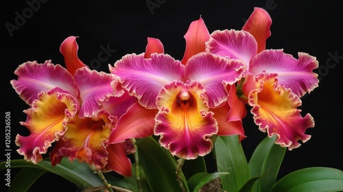 © huhu, Fototapeta premium Three vibrant pink and orange Cattleya orchids with ruffled petals against a black background.