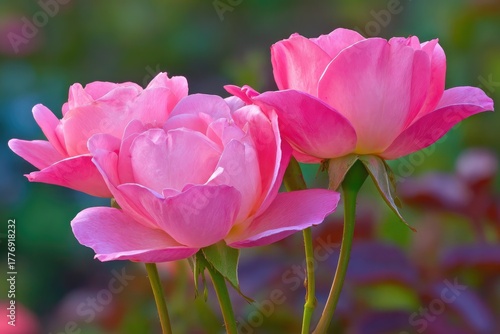 © Biru, Fototapeta premium Three vibrant pink roses in close-up, soft focus background