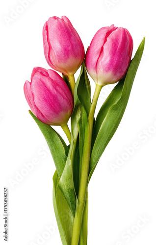 © Adri, Fototapeta premium Three vibrant pink tulips, close-up, on a dark background