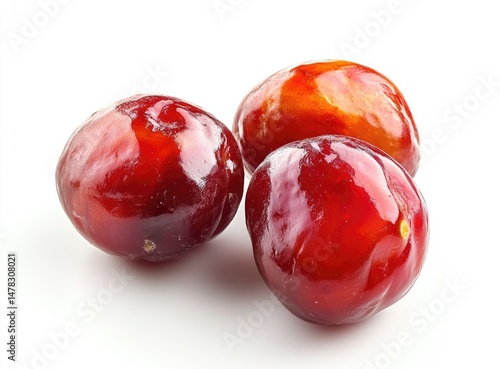 © Ryu, Obraz premium Three vibrant red plums close-up