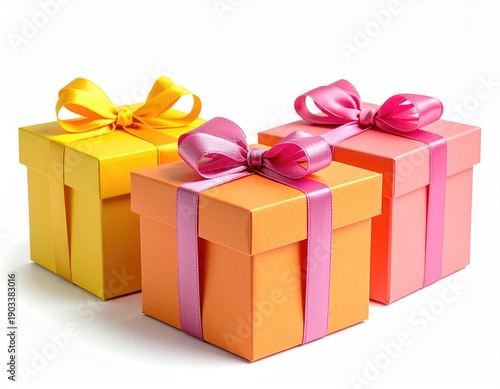 © Sri, Obraz premium Three vibrant wrapped gift boxes with silk bows