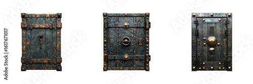 Fototapeta premium Three Vintage Metal Vault Doors. Security And Protection In Industrial Design Isolated On Transparent Background