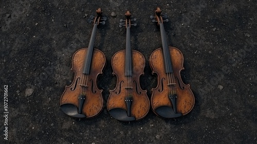 Naklejka premium Three Vintage Violins on Weathered Ground Rustic Music Instrument Trio