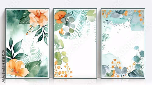 © Saysamorn, Fototapeta premium Three watercolor art posters with a continuous image, creating a harmonious and stylish wall display on a white background