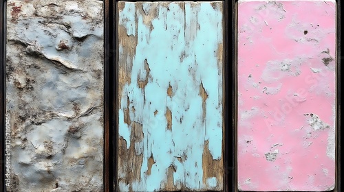 Naklejka premium Three weathered painted wood panels display a unique texture