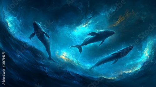 Fototapeta premium Three whales leap through a glowing, cosmic ocean