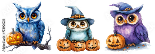 Fototapeta premium Three whimsical owls in witch hats surrounded by Halloween pumpkins.