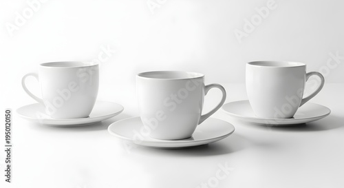 © TanimHasan, Fototapeta premium Three white ceramic coffee cups on saucers