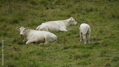 Obraz premium Three white cows resting and grazing on a grassy field.