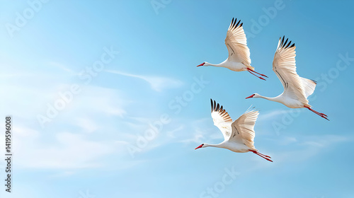 © predator, Fototapeta premium Three White Cranes Soaring Through A Light Blue Sky