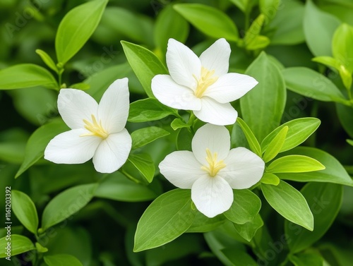 © Manganese, Fototapeta premium Three White Flowers in Lush Green Foliage